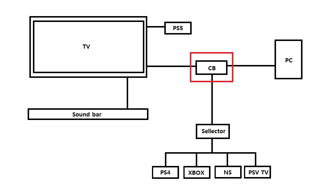 콘솔들(PS4, Xbox one X, Nintendo Switch, PS Vita TV)을 셀렉터에 물려 이것을 캡처보드 HDMI in에 물립니다.