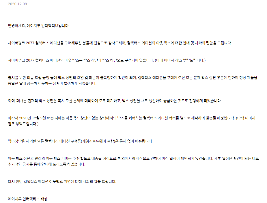아웃박스가 파손되어 추후에 배송한다는 이야기였습니다. 필자는 게임도 연기되고 한정판 구성품도 연기되는 부분에 화가 났지만 어쩔 수 없이 기다릴 수밖에 없었습니다. 한 달 내에는 오겠지 하였던 구성품은 오지 않았고 필자 또한 기억에서 잊을 때쯤 다시금 연락이 왔습니다.