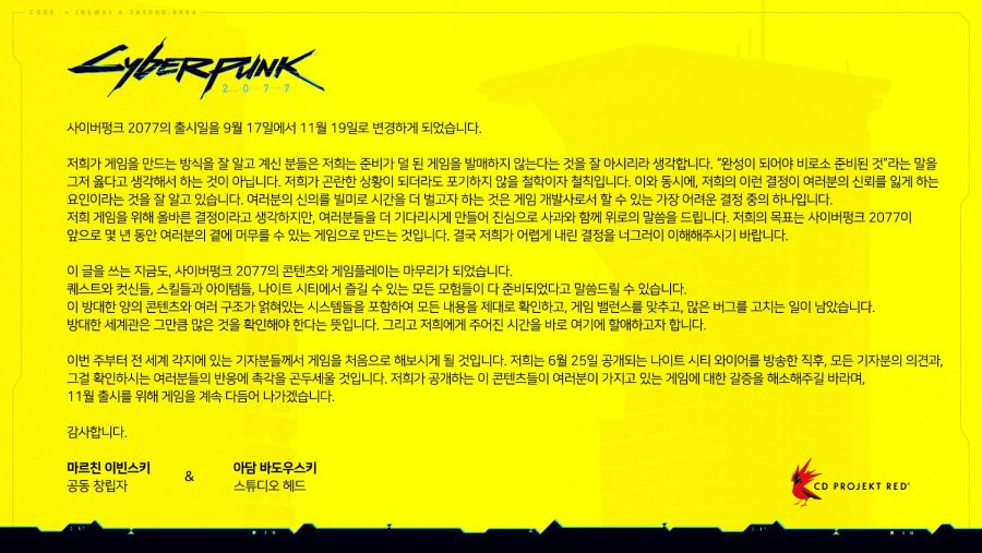 2019년에 구매를 하였지만 3번에 연이은 연기로 인하여 할부로 긁은 카드값이 끝날 때까지 게임이 발매되지 않았고 출시 당일 12월에 배급을 받은 H2 인터렉티브에서 충격적인 발표를 하게 됩니다.