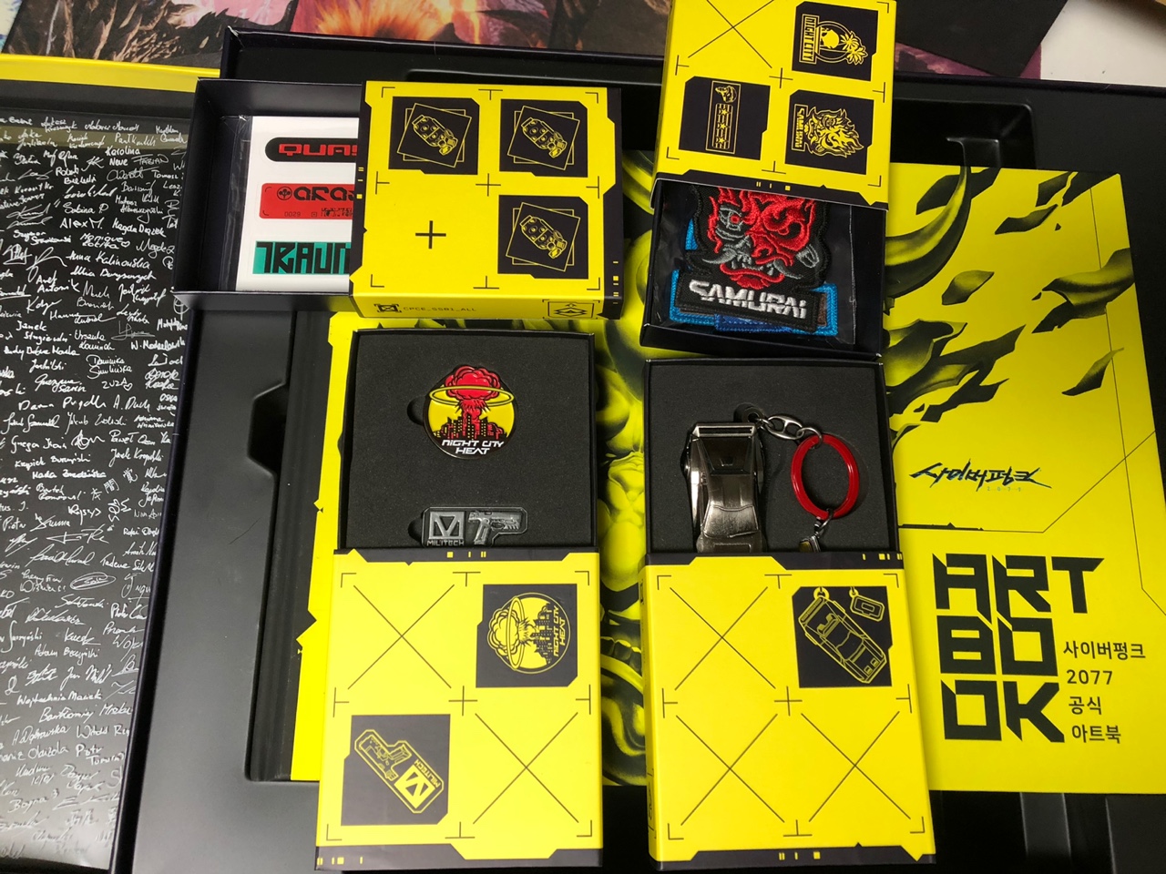 박스를 열면 한면은 싸인이 되어 있는 아크릴판과 패키지가 있었습니다. 다른 한 면은 공식 아트북과 자수 패치, 스티커, 열쇠고리, 철제 핀이 있었습니다. 퀄리티가 좋아서 감탄이 절로 나왔습니다.